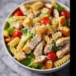 - Assemble and Serve: Just before serving, add the chopped Romaine lettuce and seasoned croutons to the chilled pasta and chicken mixture. Pour in the desired amount of prepared Caesar dressing and toss gently to combine all ingredients evenly. Top the salad with additional Parmesan cheese. Serve immediately and enjoy!