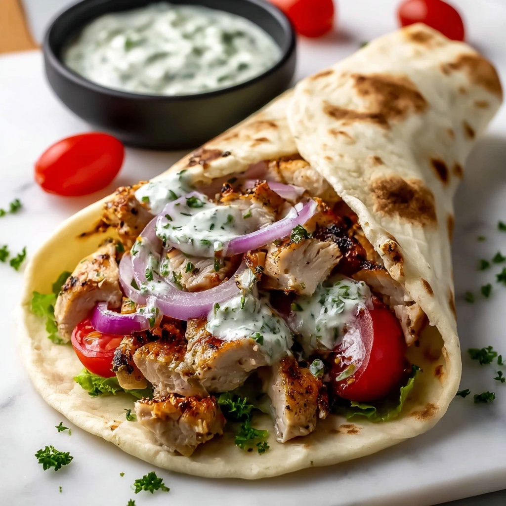 Once cooked, chop the chicken into bite-sized pieces that fit perfectly inside the pita. Warm your pita breads gently in a dry skillet or microwave — warm pita makes the whole experience so much more comforting. Now it’s time to build your gyro: a generous handful of chicken, a dollop of creamy tzatziki, a few crunchy slices of red onion, and a handful of juicy cherry tomatoes. Wrap it up and get ready for a bite of heaven.