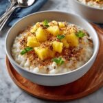 Coconut Pineapple Rice Pudding is a creamy, tropical dessert combining tender jasmine rice, rich coconut milk, and sweet pineapple. This comforting pudding is flavored with vanilla and cinnamon, creating a luscious treat perfect for serving warm or chilled. Garnished with toasted coconut flakes, it offers a delightful texture and exotic flair.