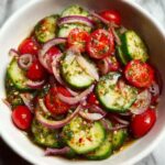 A quick and refreshing cucumber salad featuring crisp cucumbers, sweet cherry tomatoes, and sharp red onion tossed in a tangy olive oil and apple cider vinegar dressing, perfect for a light side or healthy snack.