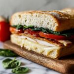 If you’re craving a sandwich that transcends the ordinary, the Gourmet Ciabatta Sandwich with Grilled Chicken, Fresh Mozzarella, Roasted Red Peppers, and Balsamic Glaze Recipe is your perfect go-to. This delightful creation brings together tender grilled chicken, creamy fresh mozzarella, and sweet roasted red peppers, all nestled inside a crusty yet soft ciabatta bread. The finishing touch of balsamic glaze and garlic aioli adds a symphony of flavors that dance on your palate with every bite. Whether it’s a quick lunch or a fancy picnic treat, this sandwich promises a gourmet experience that’s irresistibly delicious.