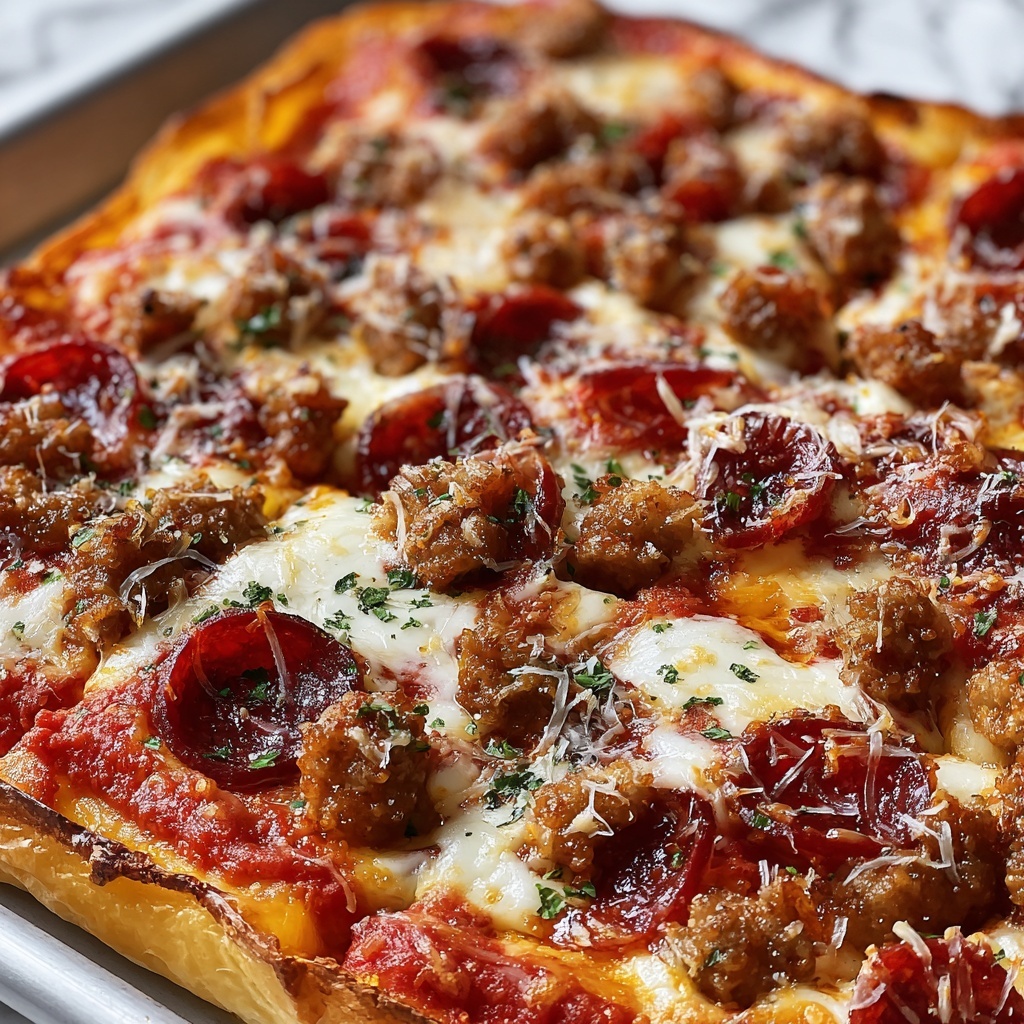This Ultimate Meat Feast Pizza Casserole combines the flavors of your favorite meat lovers pizza into a comforting, easy-to-make casserole. Ground beef, sausage, pepperoni, and Italian seasonings blend with rich tomato basil sauce and melted cheeses, all topped with a crispy pizza crust baked to golden perfection. Perfect for a hearty family dinner that satisfies pizza cravings in casserole form.