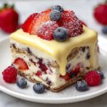 Summer Berry Bliss Icebox Delight is a no-bake, layered dessert featuring a crunchy graham cracker base, creamy vanilla pudding mixed with cream cheese and whipped topping, and fresh strawberries and blueberries. Chilled for hours to soften the layers and topped with melted white chocolate, this refreshing summer treat serves 12 and is perfect for gatherings.
