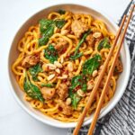 This Sweet & Spicy Hot Chili Chicken Noodles with Basil recipe combines tender ground chicken simmered in a flavorful sauce made with ginger, garlic, chili paste, and fresh basil, served over perfectly cooked ramen noodles. The dish strikes a delicious balance of sweetness, spice, and umami, topped with crunchy roasted nuts and fresh basil ribbons for a satisfying meal that comes together in about 45 minutes.