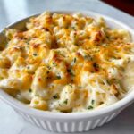 Tini’s Viral Mac and Cheese is a creamy, cheesy baked pasta dish featuring a blend of mozzarella, Colby Jack, and sharp cheddar cheeses. The sauce is rich and velvety, made with butter, flour, evaporated milk, and heavy cream, seasoned with Dijon mustard, garlic, onion powder, and smoked paprika. This comforting casserole is layered and baked to bubbly perfection, optionally broiled for a golden crust, and garnished with fresh herbs for added brightness.